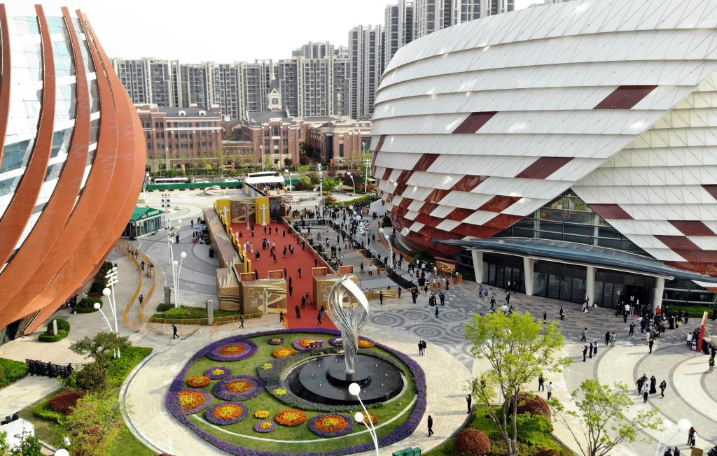 這是4月27日拍攝的第二十屆中國電影華表獎頒獎活動室外紅毯區(qū)(無人機(jī)照片)。新華社記者 李紫恒 攝
