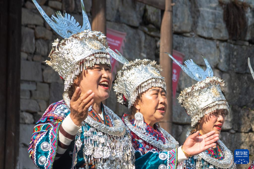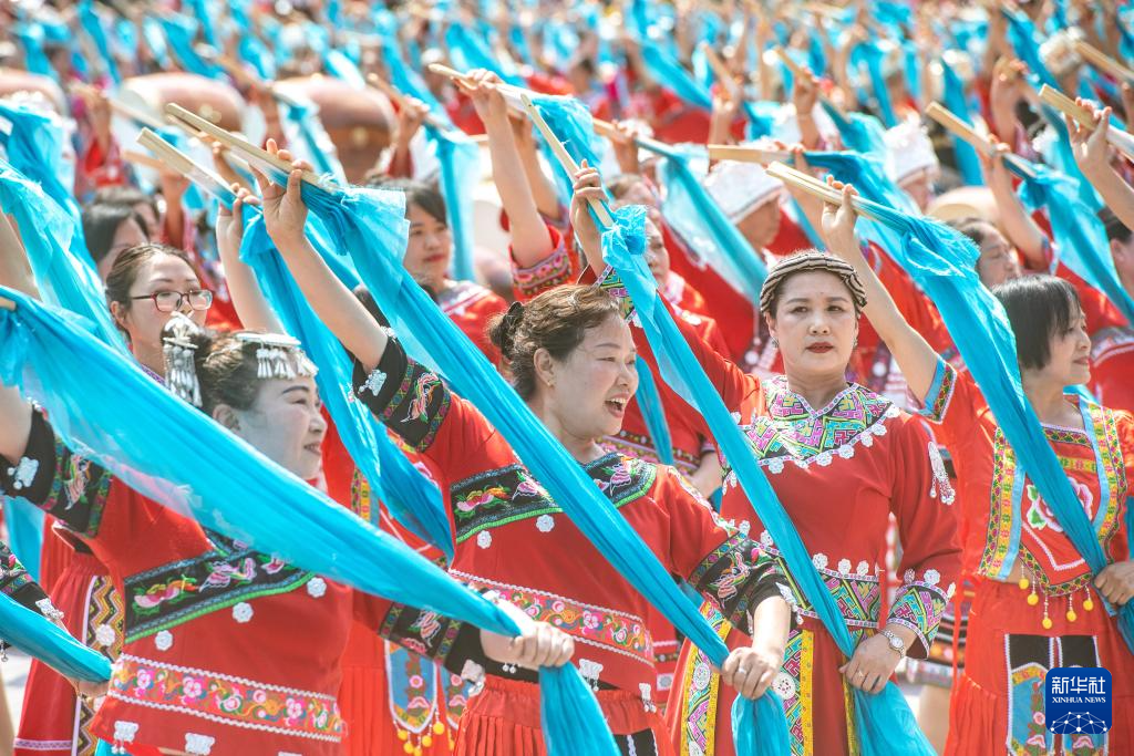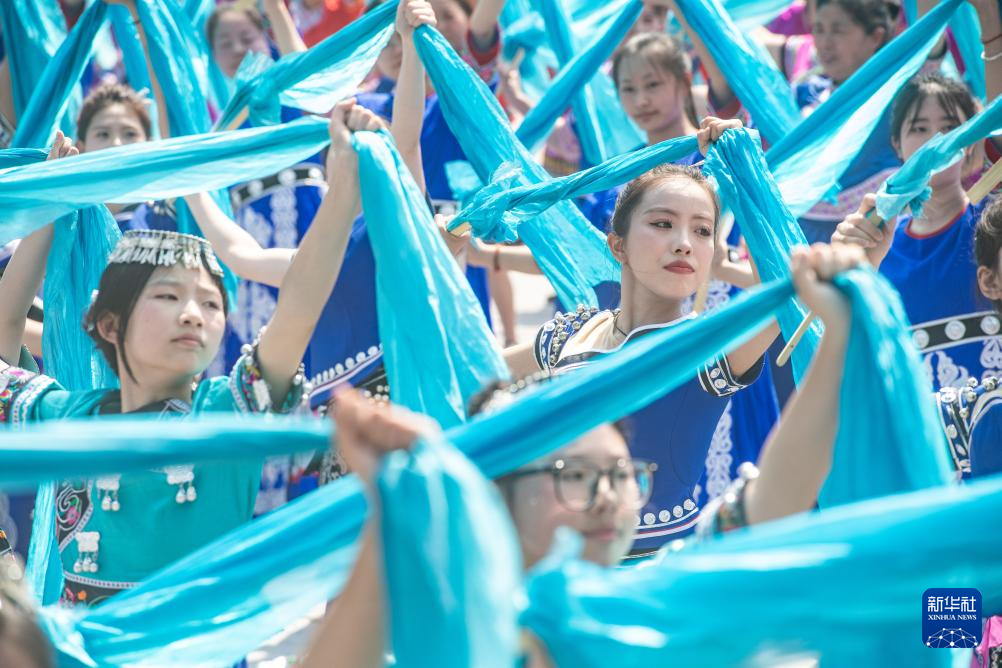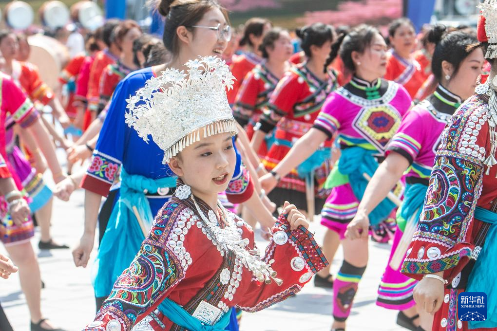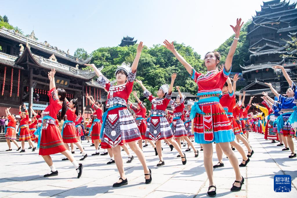 當(dāng)日,第十四屆烏江苗族踩花山節(jié)在重慶市彭水苗族土家族自治縣的蚩尤九黎城啟幕。來自全國(guó)各地的游客和穿著節(jié)日盛裝的苗鄉(xiāng)兒女,同唱嬌阿依、共舞踩花山,一起歡慶苗族的傳統(tǒng)節(jié)日。