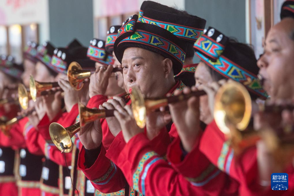 4月28日,苗族同胞在傳統(tǒng)節(jié)日踩花山節(jié)上演奏樂器。