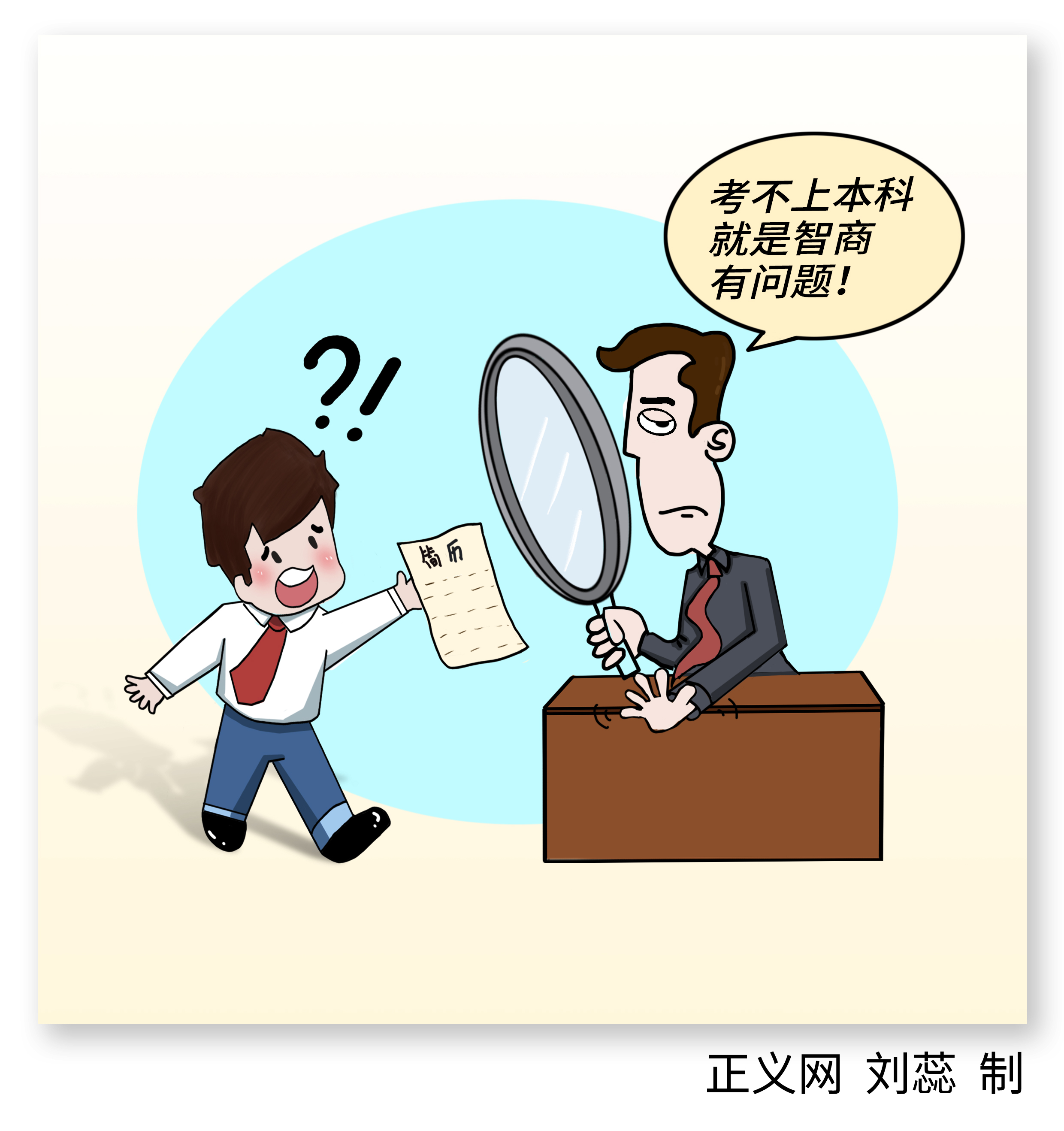 近日,一求職者在線上某招聘平臺求職時遇到學(xué)歷歧視,涉事公司工作人員稱“考不上本科都是智商有問題”,引發(fā)輿論熱議。(據(jù)3月17日《都市時報》)