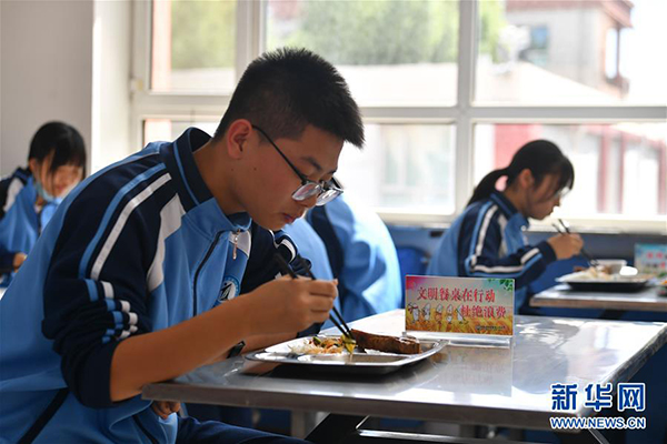 9月7日,在呼和浩特鐵路第一中學(xué)食堂,學(xué)生們在用餐。近日,內(nèi)蒙古自治區(qū)呼和浩特市加強“厲行節(jié)約、反對浪費”宣傳,采取多項措施倡導(dǎo)大眾節(jié)約用餐。