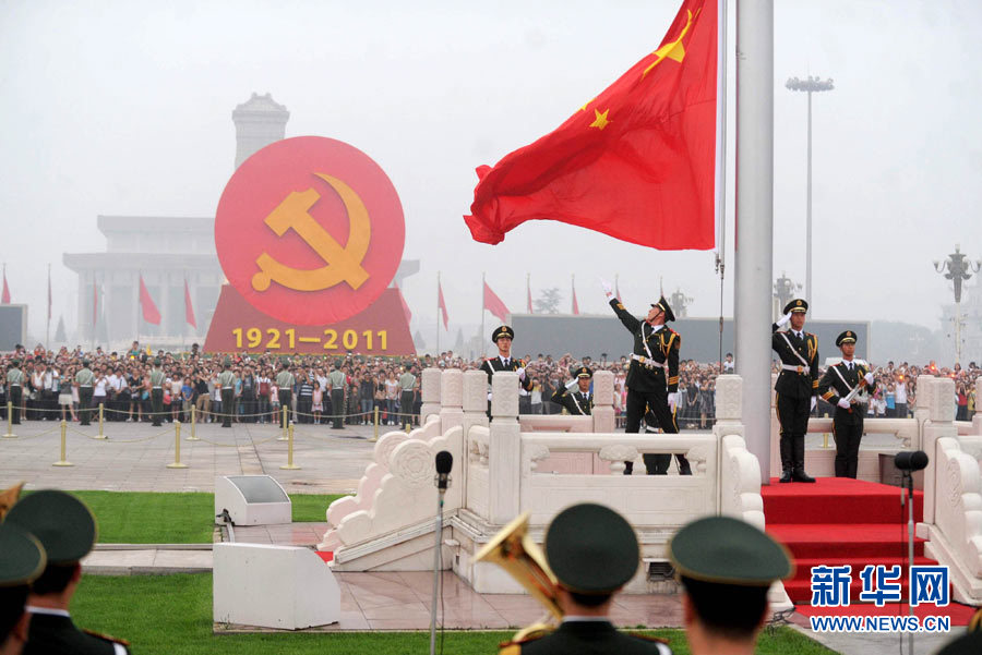 7月1日,國旗護(hù)衛(wèi)隊?wèi)?zhàn)士護(hù)送國旗走向升旗臺。當(dāng)日,來自全國各地的數(shù)萬名群眾匯聚北京天安門廣場,觀看隆重的升旗儀式,紀(jì)念中國共產(chǎn)黨成立90周年。 新華社記者 羅曉光 攝
