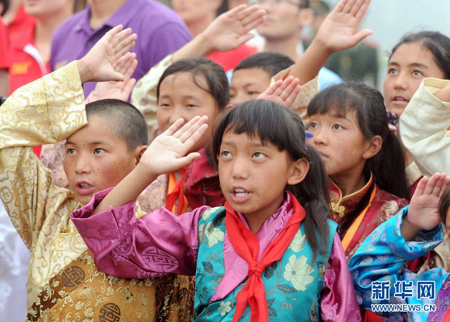 7月1日,來自西藏山南地區(qū)乃東縣中學(xué)的師生在天安門廣場參加升旗儀式。當(dāng)日,來自全國各地的數(shù)萬名群眾匯聚北京天安門廣場,觀看隆重的升旗儀式,紀(jì)念中國共產(chǎn)黨成立90周年。 新華社記者 羅曉光 攝