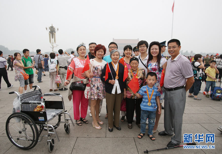 7月1日,五世同堂的楊明聰(前排左四)一家人在天安門廣場前合影留念。當(dāng)日,來自全國各地的數(shù)萬名群眾匯聚北京天安門廣場,觀看隆重的升旗儀式,紀(jì)念中國共產(chǎn)黨成立90周年。 新華社發(fā)(萬象 攝)