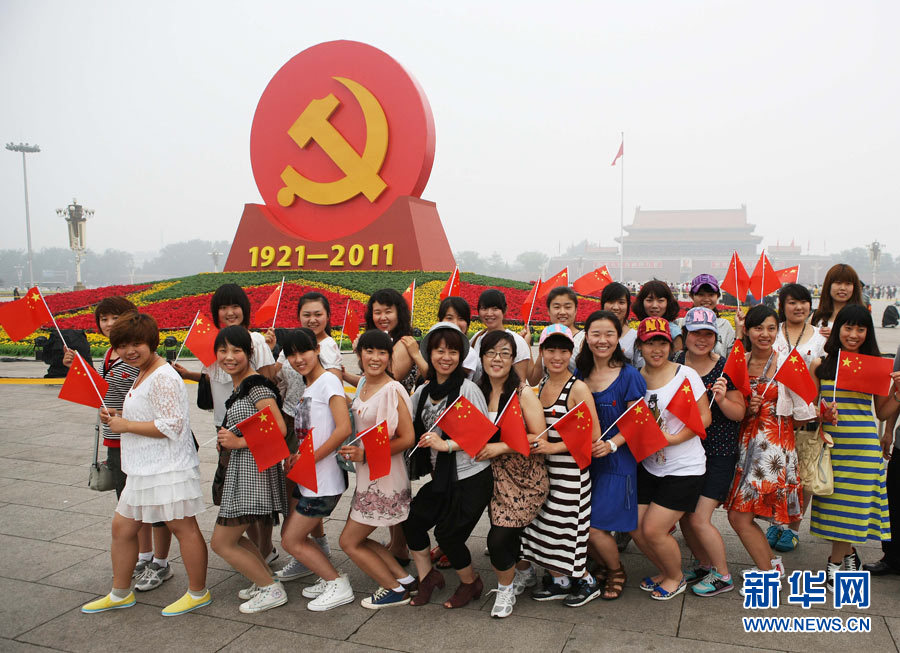 7月1日,一隊游客在廣場“紅心向黨”花壇前合影。當(dāng)日,來自全國各地的數(shù)萬名群眾匯聚北京天安門廣場,觀看隆重的升旗儀式,紀(jì)念中國共產(chǎn)黨成立90周年。 新華社發(fā)(李方宇 攝)