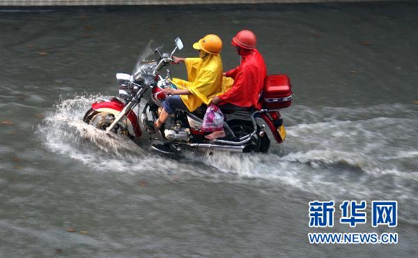 7月3日,兩名市民在成都市武侯區(qū)長壽南路的積水路段騎車前行。新華社發(fā)(薛玉斌 攝)
