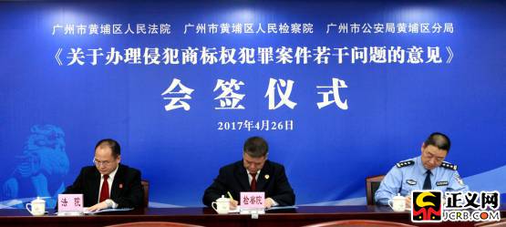 正義網(wǎng)廣州4月26日電(記者鐘亞雅 通訊員周園)今日是世界知識產(chǎn)權(quán)日,(2017年4月26日)上午,廣州市黃埔區(qū)人民法院、廣州市黃埔區(qū)人民檢察院、廣州市公安局黃埔區(qū)分局《關(guān)于辦理侵犯商標(biāo)權(quán)犯罪案件若干問題的意見》(以下簡稱《意見》)聯(lián)簽儀式在廣州市黃埔區(qū)人民檢察院舉行。該意見將在三單位聯(lián)簽后正式印發(fā),并指導(dǎo)一線公檢法辦案干警的實(shí)際工作。