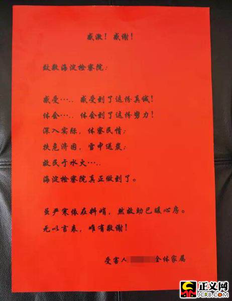 宣布會(huì)現(xiàn)場(chǎng),被害人子女接過20萬救助金時(shí),激動(dòng)地對(duì)在場(chǎng)檢察官說:“我們沒有想到檢察官會(huì)主動(dòng)跟我們提司法救助的事,更沒想到你們能救助我們這么及時(shí)和有力。我母親受傷后,家人心理上受到很大煎熬,現(xiàn)在每個(gè)月的醫(yī)療費(fèi)都要十萬元,我們也試著尋求其他救助,但是程序繁瑣、幫助有限。最終是在檢察院我們切實(shí)地感受到了你們是真心想幫助我們……”隨后他們拿出精心準(zhǔn)備的感謝信,一字一句讀出來:“海淀檢察院深入實(shí)際、體察民情;扶危濟(jì)困、雪中送炭……”