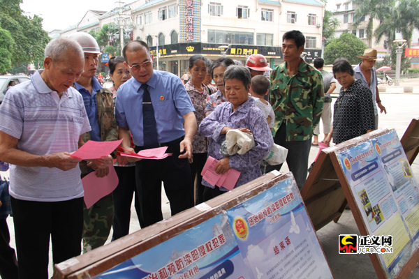迎著群眾高漲的情緒,參加活動的檢察干警迅速打開電腦,播放使用當(dāng)?shù)胤窖凿浿频男麄麂浺?進(jìn)一步營造良好的宣傳氛圍。接著,干警們開始散發(fā)資料、解答疑惑、記錄情況?吹接腥罕娐燥@羞澀,不敢過來索取資料的,年輕的檢察人員主動把資料給遞過去。有要咨詢問訊或反映情況的,參加活動的院領(lǐng)導(dǎo)熱情地接待了他們,及時處理他們的問題。