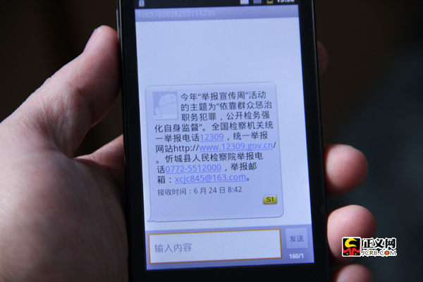 忻城縣檢察院“舉報(bào)宣傳周”活動的宣傳短信內(nèi)容。黃啟平 攝