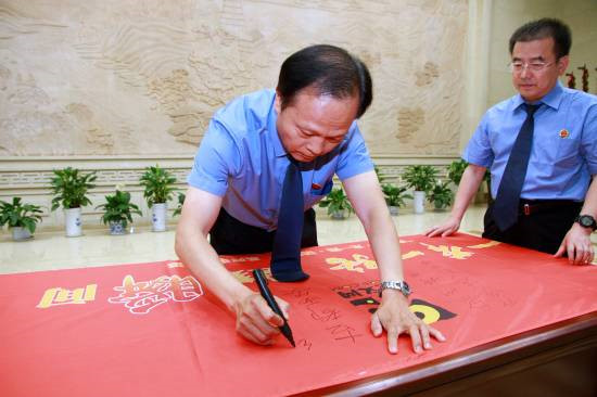 ▲西安市檢察院檢察長張民生在“一帶一路 檢察瞬間”系列活動(dòng)的旗幟上簽名。呂珊珊 攝