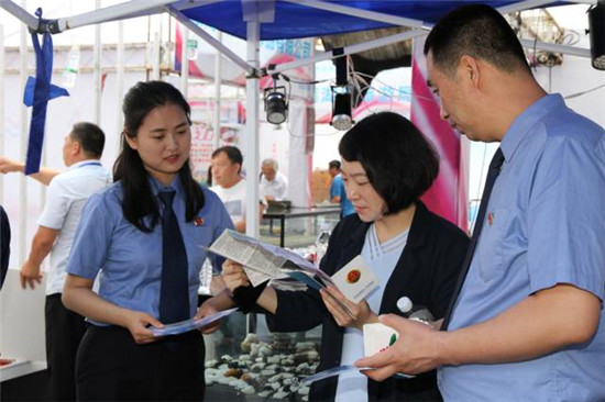 ▲西安市蓮湖區(qū)的檢察官正在為商戶發(fā)放法律宣傳資料,進(jìn)行普法宣傳。呂珊珊 攝