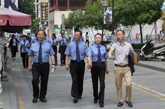 ▲西安市蓮湖區(qū)檢察院檢察長李潔帶領(lǐng)檢察官們向大唐西市商戶征求服務(wù)意見。呂珊珊 攝