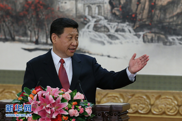 11月15日,剛剛在中共十八屆一中全會上當(dāng)選的中共中央總書記習(xí)近平和中央政治局常委李克強(qiáng)、張德江、俞正聲、劉云山、王岐山、張高麗在北京人民大會堂同采訪十八大的中外記者親切見面。這是習(xí)近平總書記發(fā)表講話。新華社記者丁林?jǐn)z
