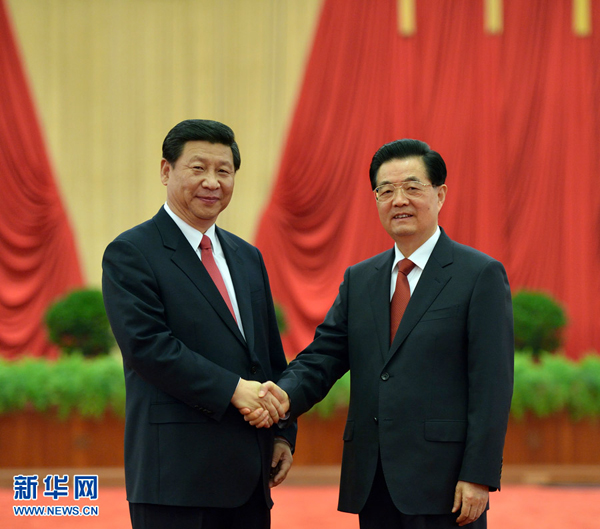 11月15日,國家主席胡錦濤,新當選的中共中央總書記、中共中央軍委主席習近平等領(lǐng)導(dǎo)同志在北京人民大會堂親切會見出席黨的十八大代表、特邀代表和列席人員并發(fā)表重要講話。這是胡錦濤和習近平親切握手。新華社發(fā)
