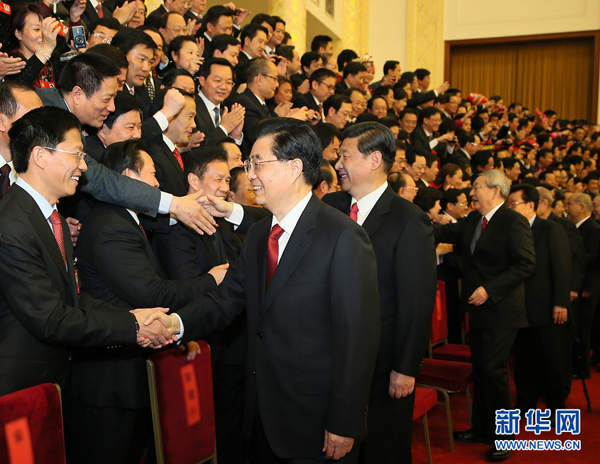 11月15日,國家主席胡錦濤,新當選的中共中央總書記、中共中央軍委主席習近平等領(lǐng)導(dǎo)同志在北京人民大會堂親切會見出席黨的十八大代表、特邀代表和列席人員并發(fā)表重要講話。新華社記者鞠鵬攝