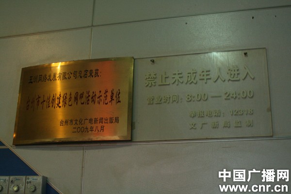 浙江省臺州市公安對全市實行網(wǎng)吧等級化管理,分為A、B、C三個等級開展檢查。圖為A級網(wǎng)吧“五洲網(wǎng)絡(luò)”禁止吸煙提示及指引標(biāo)志。中廣網(wǎng)記者 安紅麗/攝