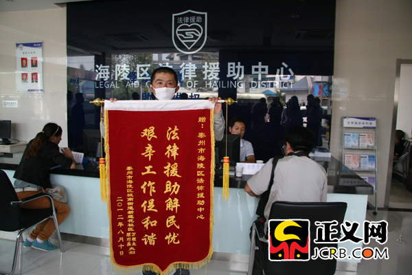 泰州市海陵區(qū)居民萬根生通過法律援助維護(hù)了自己的權(quán)益,送錦旗致謝。朱晶 攝