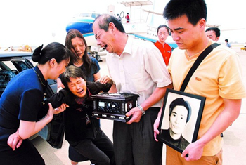 2003年12月18日,孫志剛的葬禮在他的家鄉(xiāng)湖北省黃岡市陶店鄉(xiāng)幸福村舉行。(圖片來自網(wǎng)絡(luò))