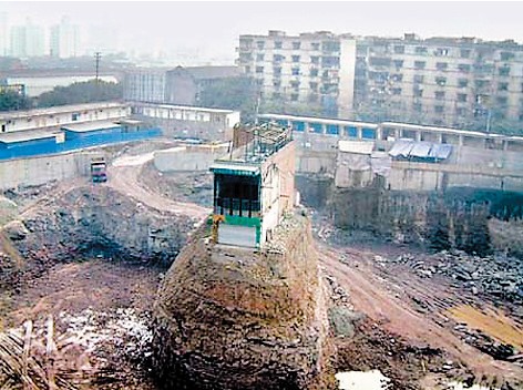 2007年3月初,網(wǎng)上開始流傳一個(gè)帖子,題目是《史上最牛的釘子戶》,內(nèi)容是一張圖片:一個(gè)被挖成10米深大坑的樓盤地基正中央,孤零零地立著一棟二層小樓,猶如大海中的一葉孤舟。(圖片來(lái)自網(wǎng)絡(luò))