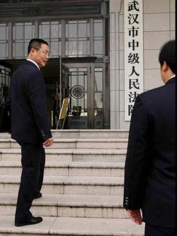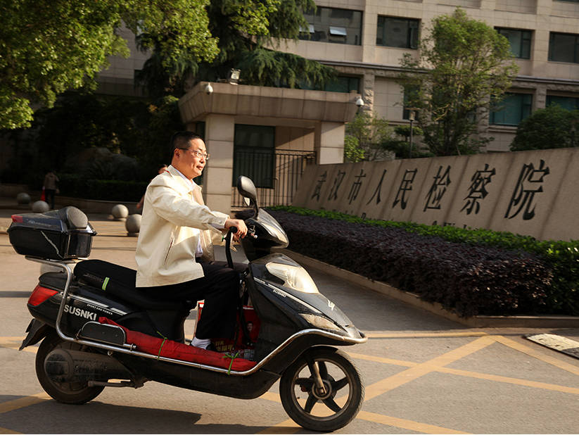 2014年5月5日上午,震驚社會的武漢男子砍殺女環(huán)衛(wèi)工案在武漢市中級人民法院開庭審理。開庭當天清晨,公訴人付建中和往常一樣,開著他的小摩托來上班。到了辦公室,他整理了一下出庭資料,換上制服,精神抖擻地與同伴一起出發(fā)了。劉明 攝