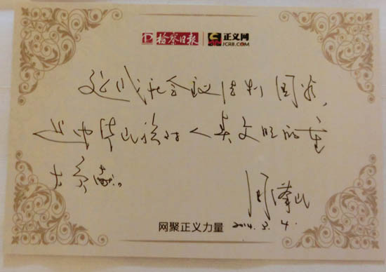 全國(guó)政協(xié)委員周漢民寄語(yǔ):建成社會(huì)主義法制國(guó)家,是中華民族對(duì)人類文明的重大貢獻(xiàn)。 正義網(wǎng)記者謝文英 攝
