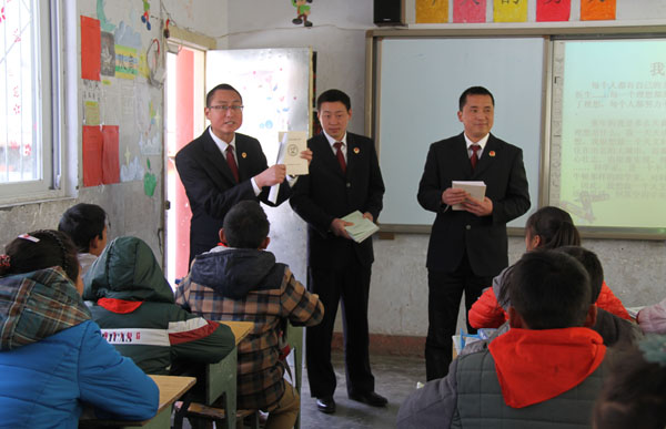 1月19日,四川省康定縣檢察院檢察官走進(jìn)三合鄉(xiāng)小學(xué),為該校高年級學(xué)生發(fā)放法制讀本,通過以案說法等形式就相關(guān)知識進(jìn)行法制宣傳。劉德華 李吉志 陶群英 攝