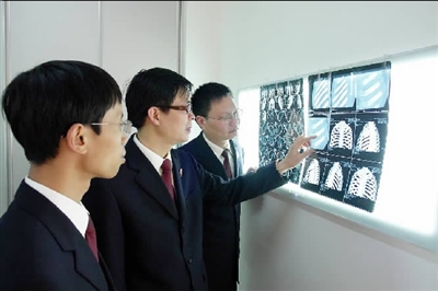漳州市檢察院司法鑒定中心的3名法醫(yī)圍在陳明花的X光片前