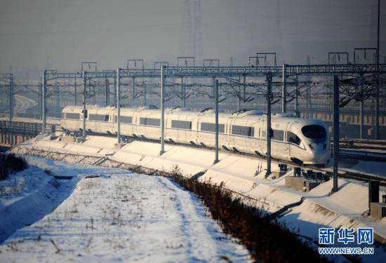 我國(guó)自主研制的第一款高寒動(dòng)車組——CRH380B準(zhǔn)備駛離哈爾濱西站(2012年12月1日攝)。