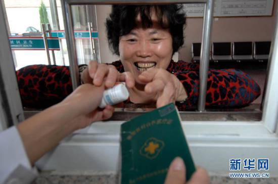 山東省乳山市東里村居民肖鳳香拿著新型農(nóng)村合作醫(yī)療證在城南社區(qū)衛(wèi)生服務(wù)中心取藥(2011年10月16日攝)。