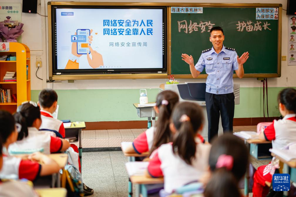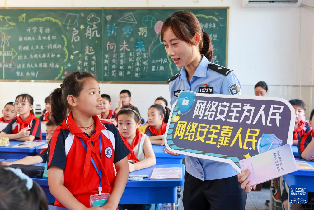 9月15日,在山東省臨沂市沂南縣第三實驗小學,沂南縣公安局網(wǎng)絡安全保衛(wèi)大隊的民警給學生普及網(wǎng)絡安全知識。