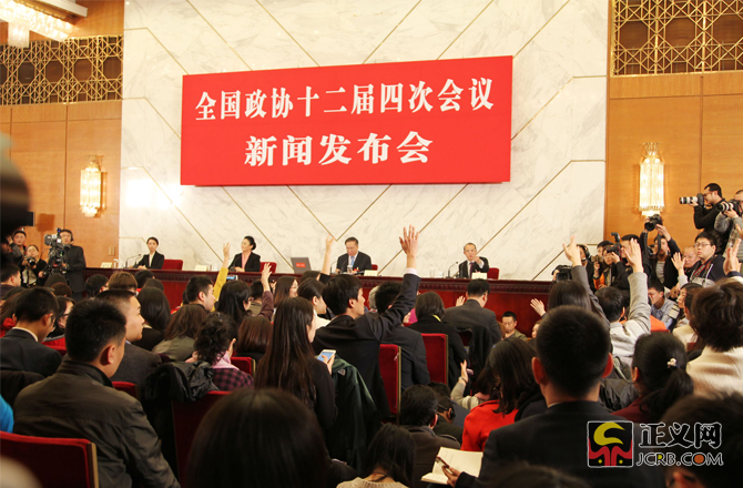 3月2日下午,全國(guó)政協(xié)十二屆四次會(huì)議新聞發(fā)布會(huì)在人民大會(huì)堂舉行,大會(huì)新聞發(fā)言人王國(guó)慶向中外媒體介紹本次大會(huì)有關(guān)情況并回答記者提問。正義網(wǎng)記者徐伯黎攝