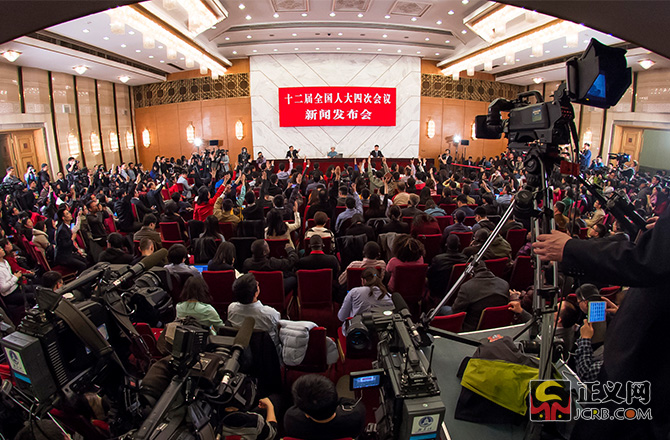 3月4日,十二屆全國人大四次會議在人民大會堂舉行新聞發(fā)布會,大會發(fā)言人傅瑩回答中外記者的提問。本次發(fā)布會共有18名中外記者提問,其中11位記者提問涉及法治話題,占提問總數的61%。民法典的編纂工作、慈善法、推進全面依法治國、全國人大審議境外非政府組織管理法草案、全國人大立法、反腐敗、《中華人民共和國反家庭暴力法》、稅收法、涉黃涉毒或者微博禁言的演員、政府依法行政、《大氣污染防治法》等。正義網記者程丁攝