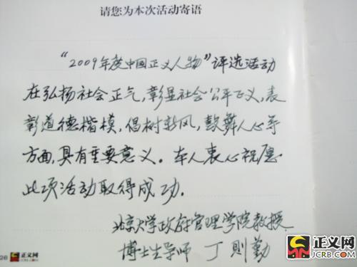 寄語(yǔ):“2009年度中國(guó)正義人物”評(píng)選活動(dòng)在弘揚(yáng)社會(huì)正氣,彰顯社會(huì)公平正義,表彰道德楷模,倡樹新風(fēng),鼓舞人心等方面,具有重要意思,本人衷心祝愿此次活動(dòng)取得成功。