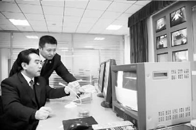 山東省棗莊市市中區(qū)檢察院實(shí)現(xiàn)了同步錄音錄像“兩套設(shè)備、雙路監(jiān)控、同時(shí)錄制”。圖為該院檢察長(zhǎng)張志強(qiáng)通過(guò)同步錄音錄像系統(tǒng)監(jiān)督查看干警規(guī)范辦案情況。 本報(bào)通訊員周波 記者盧金增攝