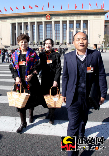 3月4日上午,十一屆全國人大四次會議召開預備會。浙江代表陳飛將帶來的環(huán)保籃送給兩位新疆代表。傅偉/攝