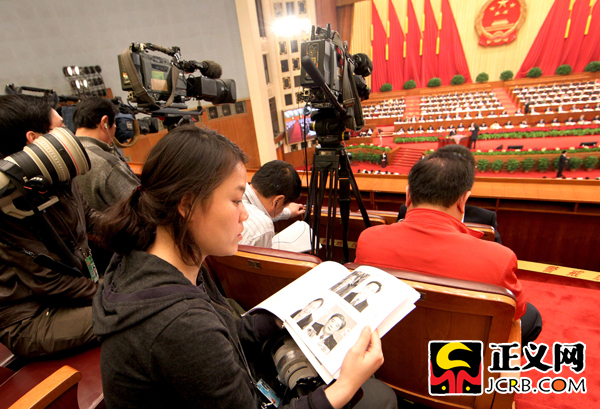 3月11日,十一屆全國(guó)人大四次會(huì)議舉行第三次全體會(huì)議,最高人民檢察院檢察長(zhǎng)曹建明作最高人民檢察院工作報(bào)告。本報(bào)記者肖杰認(rèn)真工作的鏡頭被記者抓拍。傅偉/攝