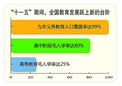 張力:“十一五”期間,全國教育發(fā)展躍上新的臺階,九年義務教育人口覆蓋率達99%,接近全面普及;高中階段毛入學率提升27個百分點,實現(xiàn)了80%的預期目標;高等教育穩(wěn)步發(fā)展,毛入學率從21%增至25%。如果說,新世紀第一個五年我國初步實現(xiàn)了從人口大國向人力資源大國的轉(zhuǎn)變,到第二個五年末,則可以說這一轉(zhuǎn)變的基礎更為牢靠。