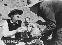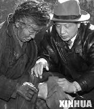 孔繁森(右)在西藏阿里日土縣過巴鄉(xiāng)為孤寡老人益西卓瑪治病