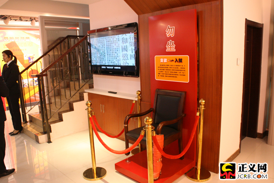 展區(qū)內的顯要位置擺放了一張代表酒色財氣組成的座椅,警示國家工作人員勿以貪欲濫用手中的權力。 張慶攝
