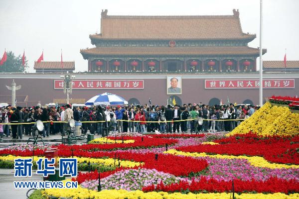 2010年10月2日,游客在北京天安門廣場游覽。當(dāng)日,北京天氣晴好,天安門、故宮地區(qū)迎來如潮的游人。 新華社發(fā)(陳柏材 攝)