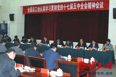 全國(guó)總工會(huì)10月20日上午召開(kāi)認(rèn)真學(xué)習(xí)貫徹黨的十七屆五中全會(huì)精神會(huì)議。中共中央政治局委員、全國(guó)人大常委會(huì)副委員長(zhǎng)、中華全國(guó)總工會(huì)主席王兆國(guó)出席會(huì)議并發(fā)表重要講話,全總黨組書(shū)記、副主席、書(shū)記處第一書(shū)記王玉普主持會(huì)議。