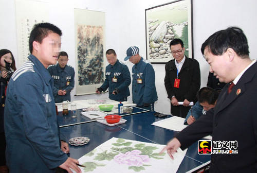 正義網(wǎng)記者與三門峽市檢察院駐硤石監(jiān)獄檢察室相關(guān)負責(zé)人觀看服刑人員藝術(shù)作品。姚宇/攝