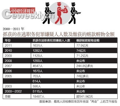 《中國經(jīng)濟周刊》從最高檢歷年“兩會”上的工作報告整理得知,自2000年底最高檢會同公安部組織開展追逃專項行動以來,至2011年,檢察機關(guān)共抓獲在逃職務犯罪嫌疑人18487名。而據(jù)最高檢公開發(fā)布的2005、2007、2009—2011年五年的數(shù)據(jù)顯示,我國這五年共繳獲贓款贓物金額達到541.9億元。